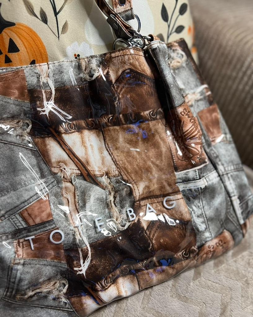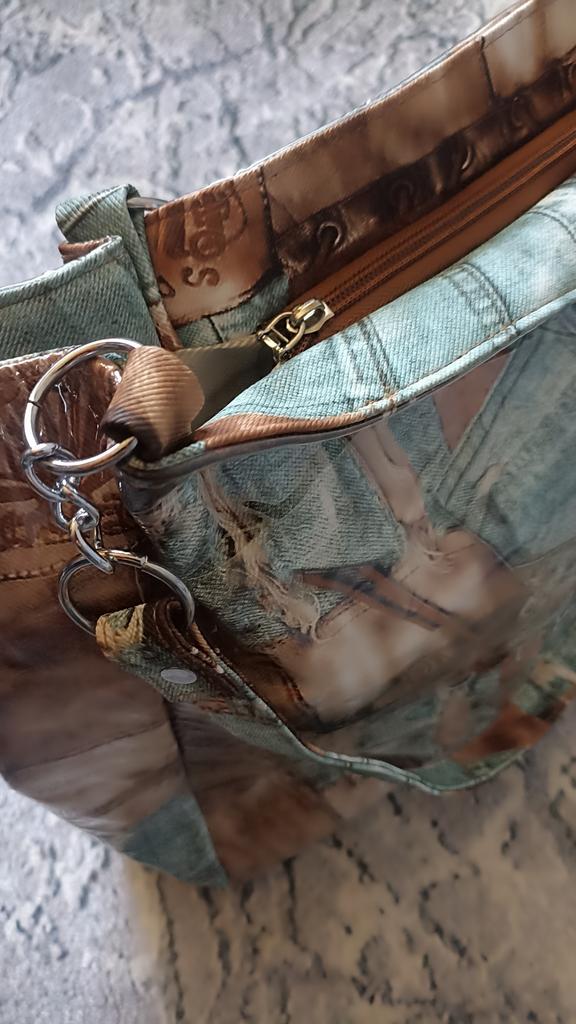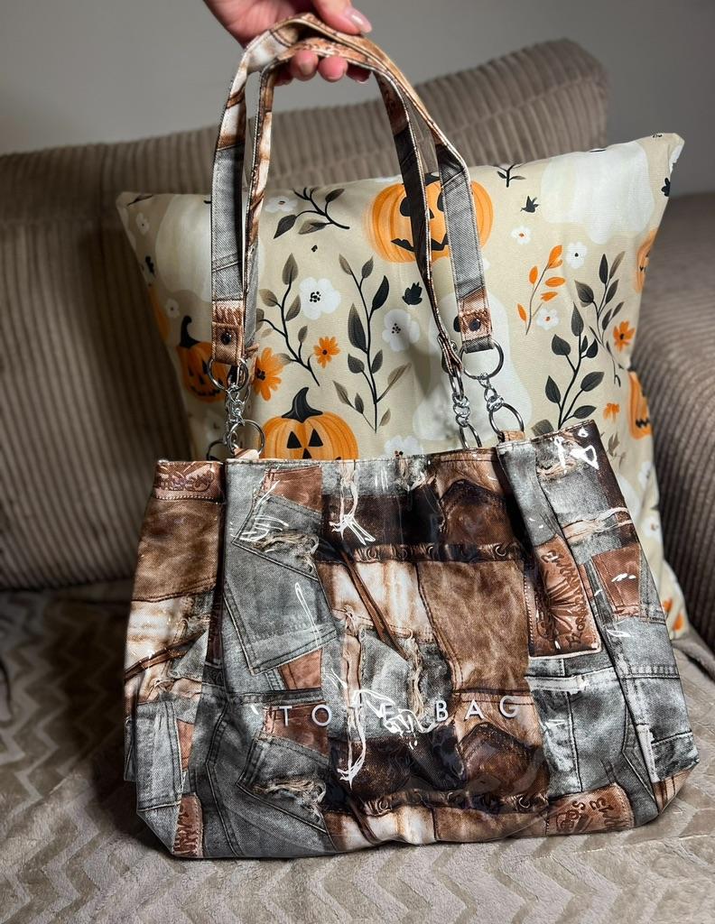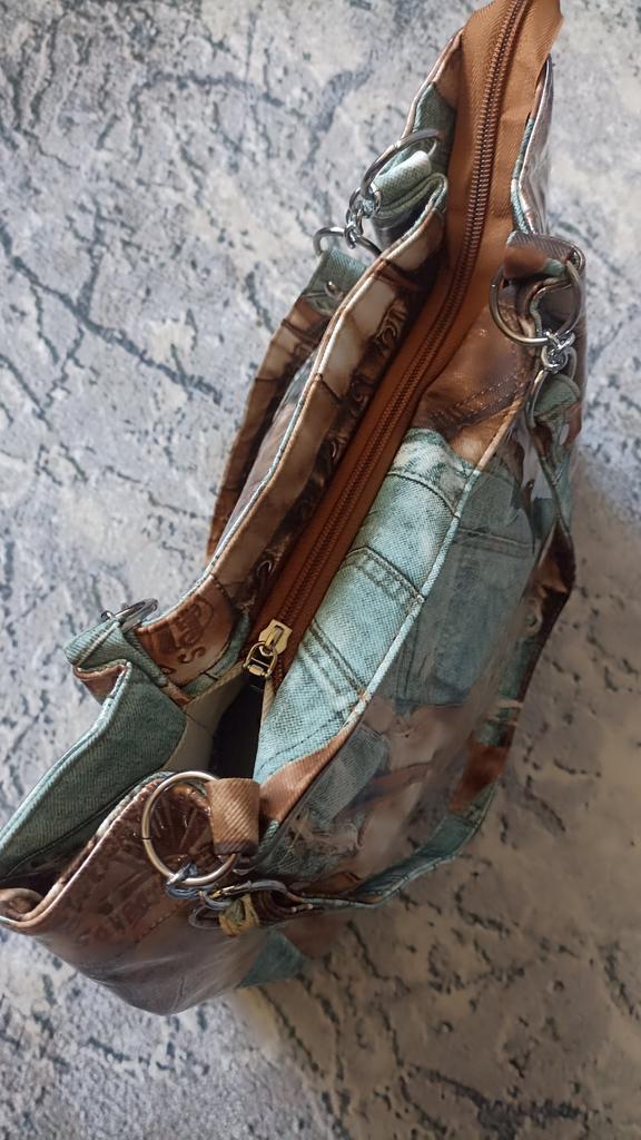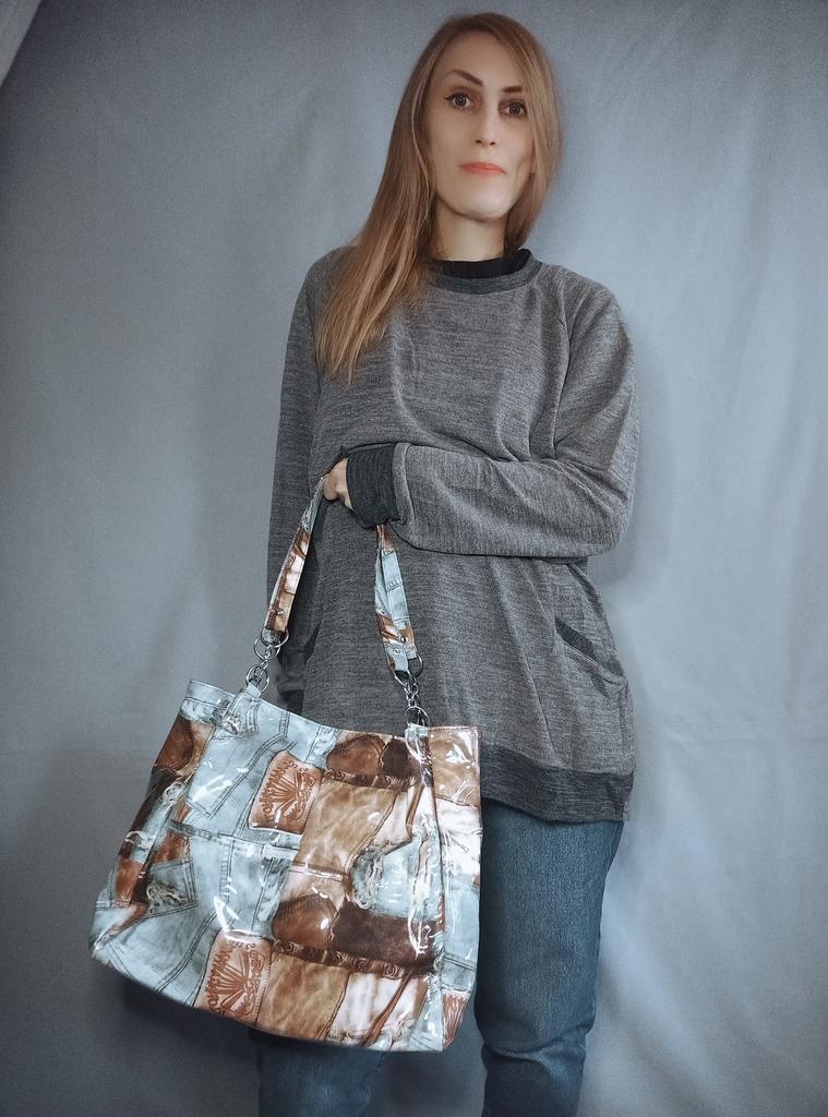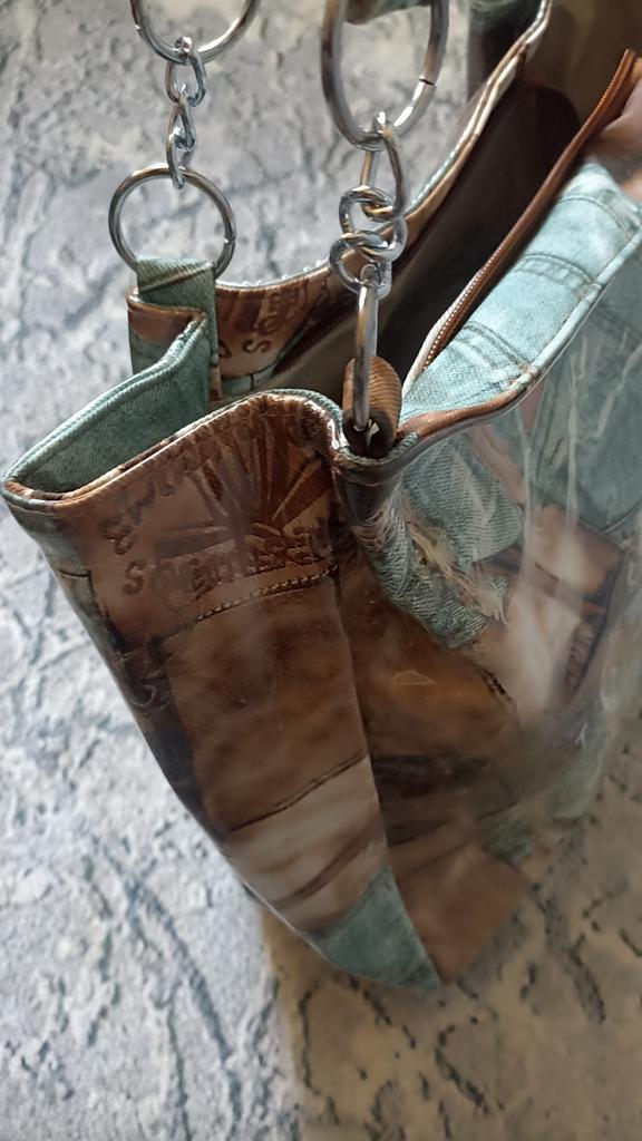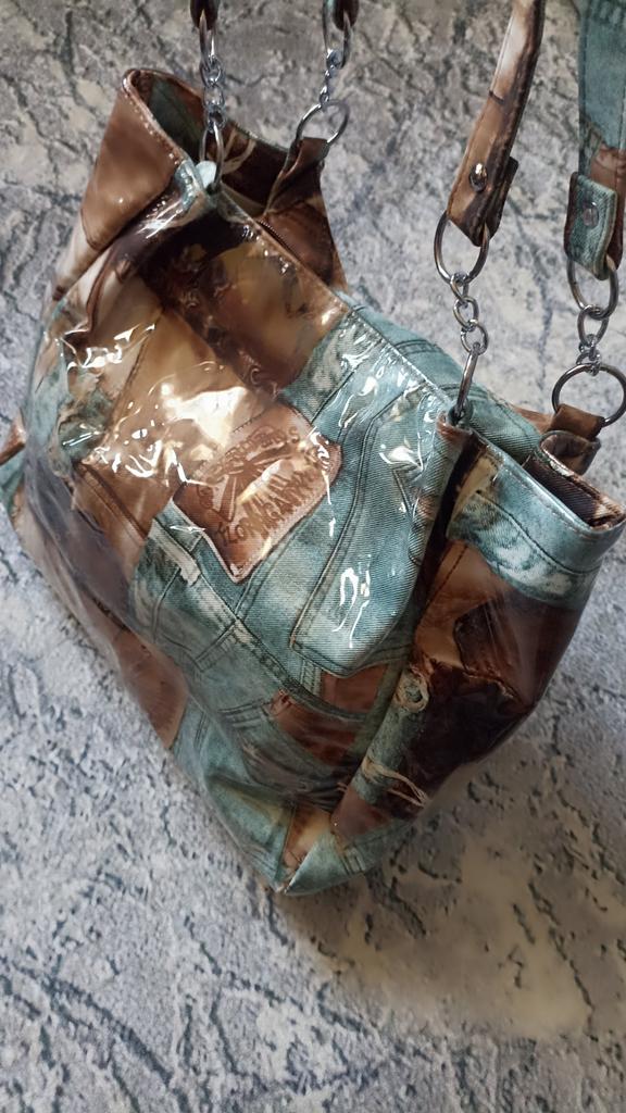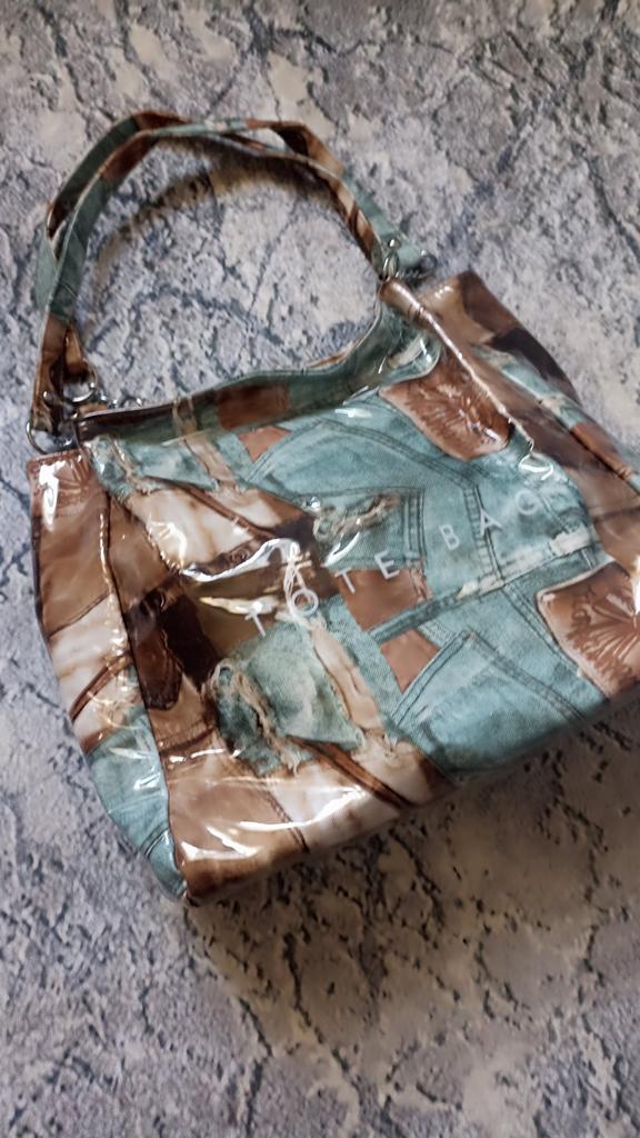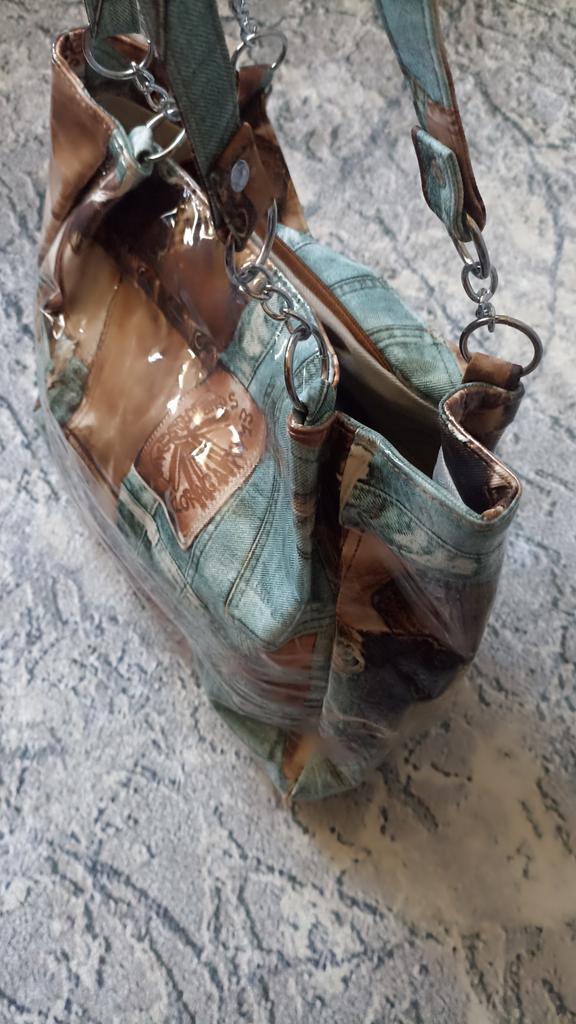 Taška - tote přes rameno, takový zajímavý vintage design - vnější "obálka" z průhledného plastu a vnitřní část je vyrobena s potiskem džínoviny. Velmi se mi líbila. Děkuji prodejci za příjemný nákup.💝