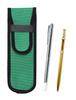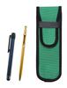 A set of a pen case with a belt fastener, a Japanese-made metal pointer, and a wooden ballpoint pen.