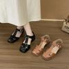 Sheepskin version~ Baotou shoes women's summer retro woven hollowed-out one-word buckle sandals women's black gas low-heeled Roman shoes