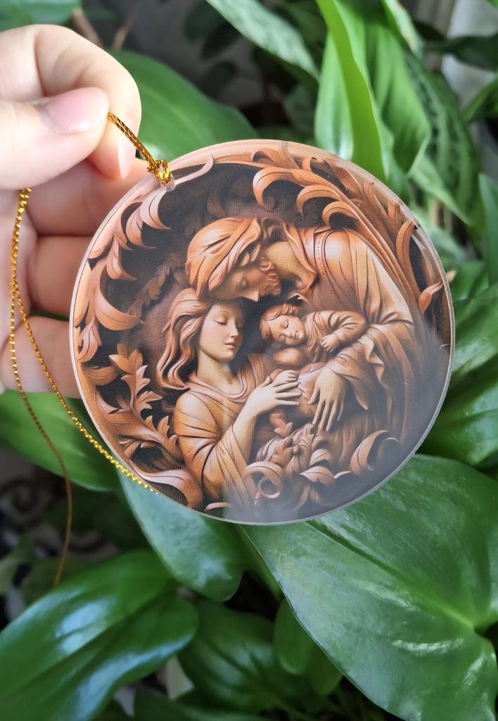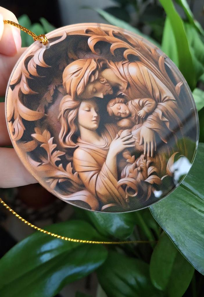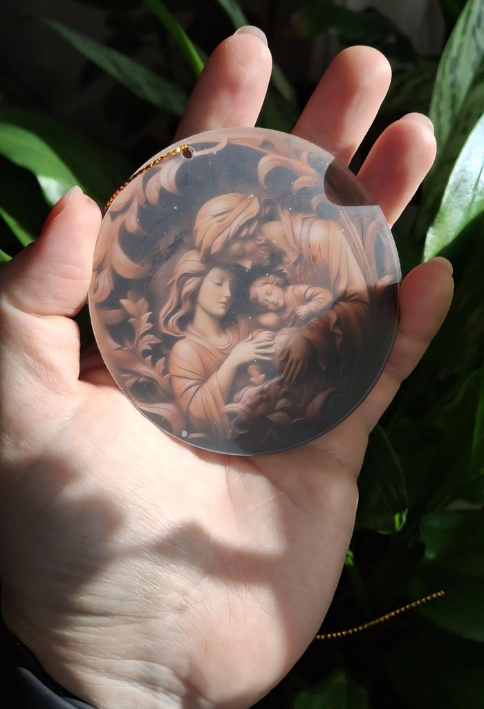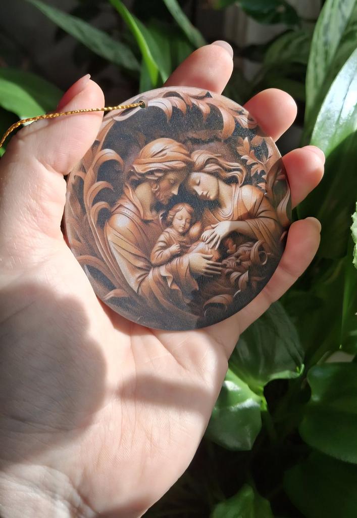 This beautiful pendant depicts the story of the birth of Jesus, symbolizing luck and blessings. The clear print on its bright surface allows the intricate pattern to shine, making it perfect for hanging on a Christmas tree.