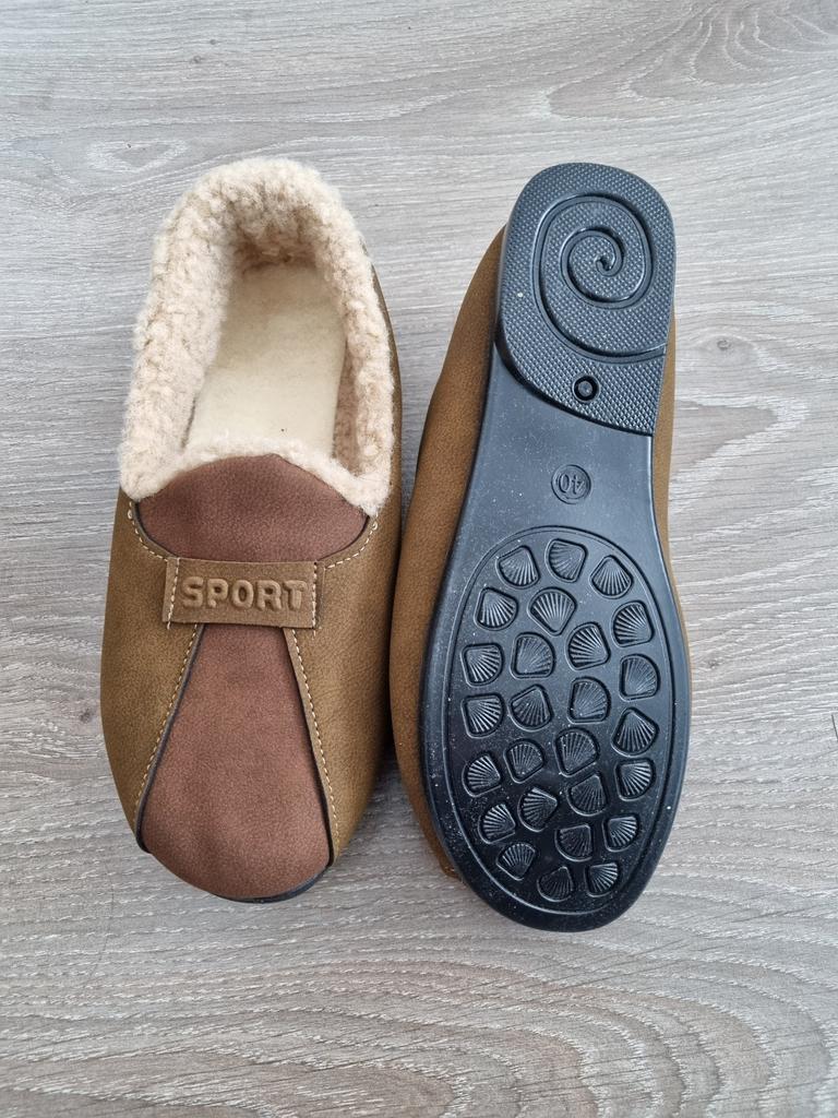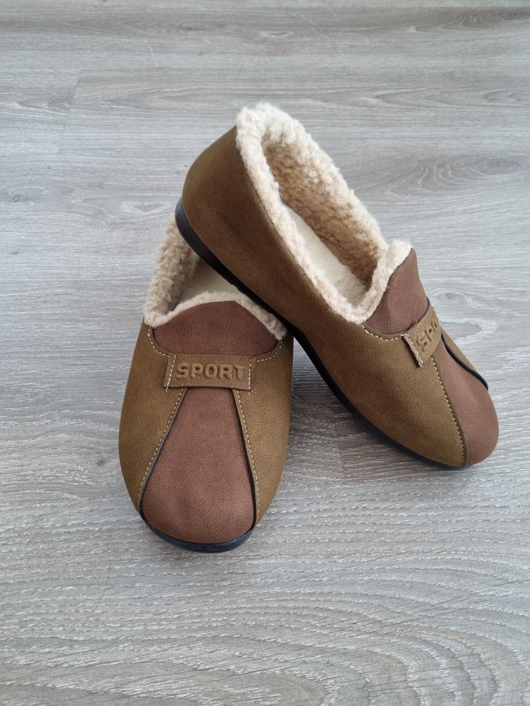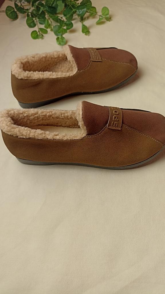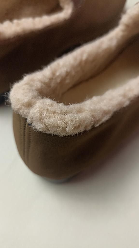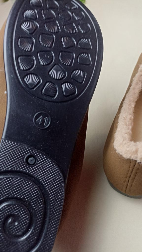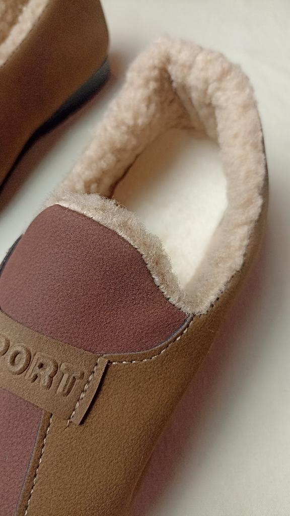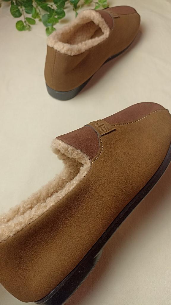 Women's moccasins or slippers with fur lining. They have an upper made of artificial suede and a soft lining of artificial fur/sheepskin, which makes them warm and comfortable to wear at home or in cold weather. Sole rubberized and non-slip. Three colors to choose from. Size 41 for a 25 cm foot. I recommend.👍