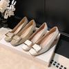 Grape mother of the same style, French elegant metal square buckle, small thick heel, shallow mouth square head flat sole single shoe, women's spring