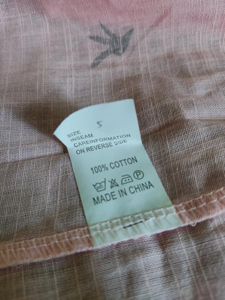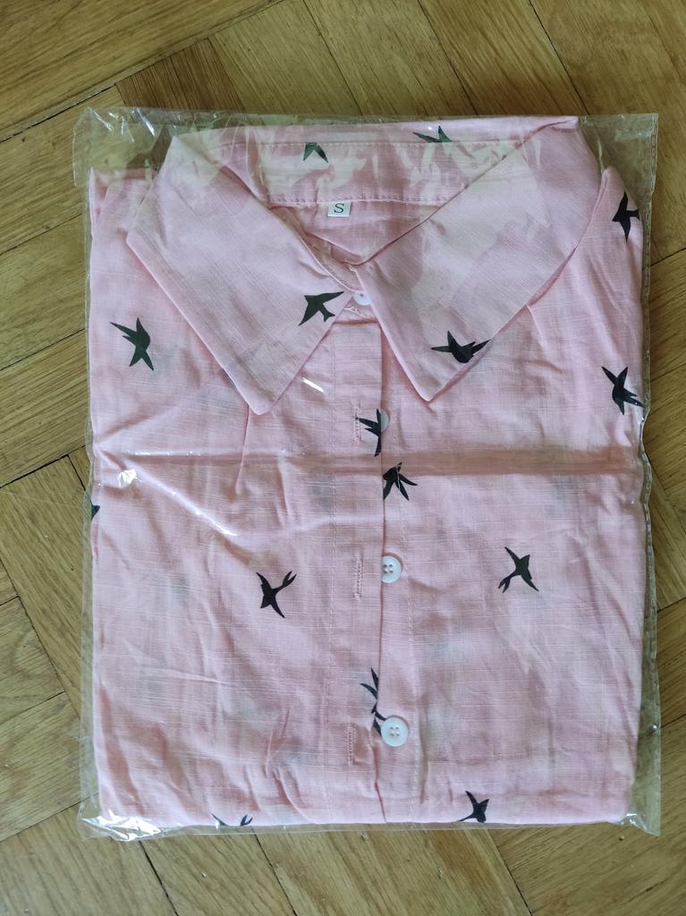 Skjorten er godt sydd, 100% bomull. Jeg valgte S, men det burde vært M. Til størrelse 44 er den litt liten – trang i bysten og kort i ermene, men sitter løst og med topp under.