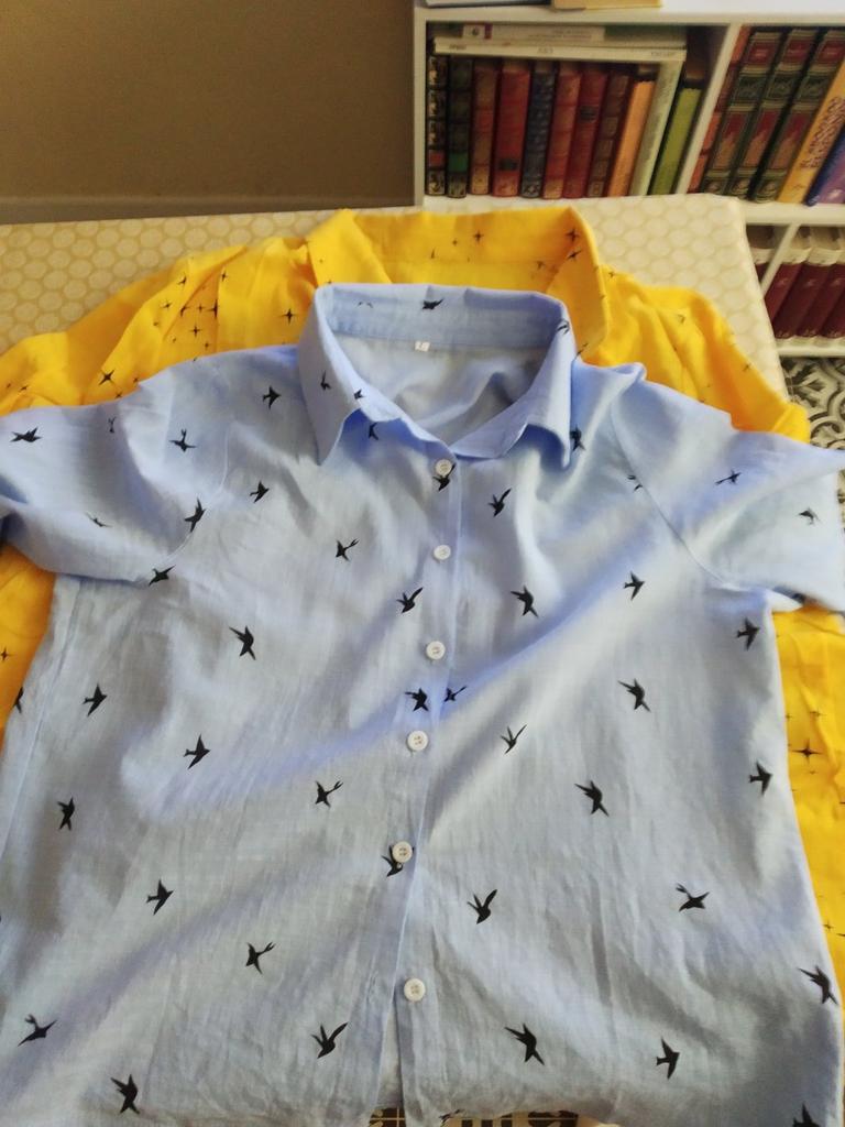 Jeg bestilte to skjorter i samme størrelse, den blå er riktig størrelse L og den gule er mye større og kuttet i størrelse.