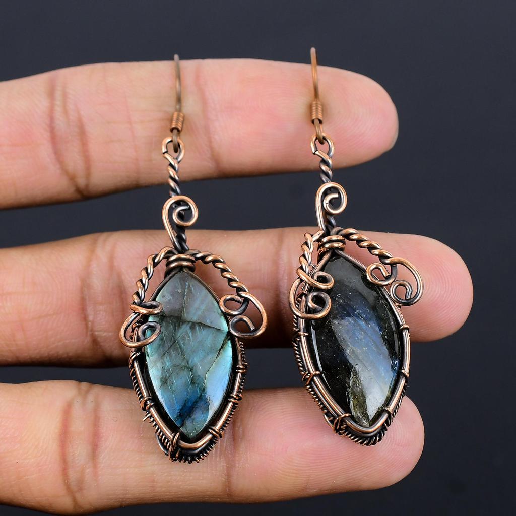 Labradorite 999 Copper Wire Wrapped Earrings, Handmade Gemstone Earrings Jewelry, Gifts For Wife Brand New Earrings
